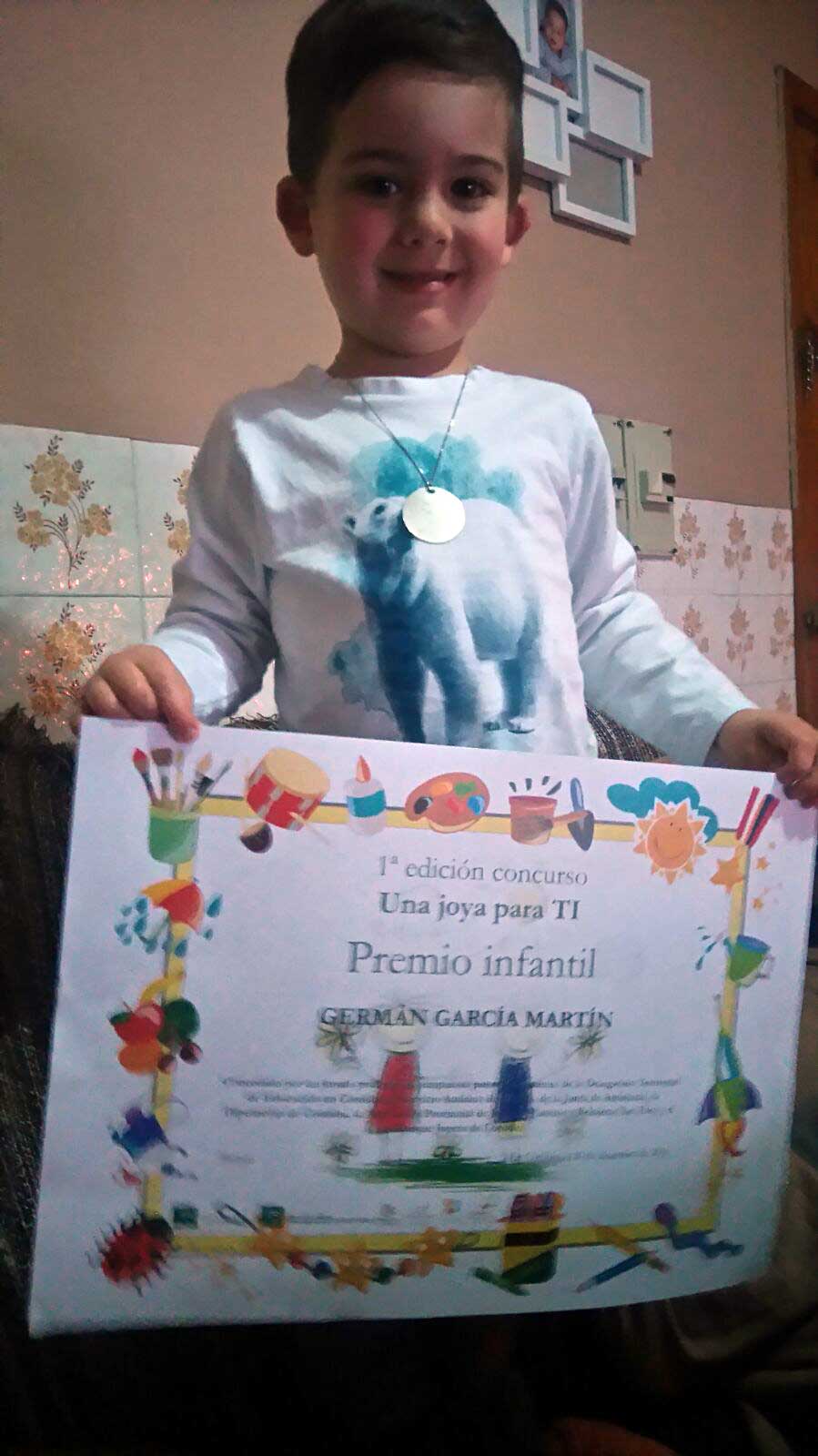 Germán García Martín, de tres años de edad y alumno del Colegio Público Miguel de Cervantes de Villanueva del Rey, se ha alzado con el primer puesto de la categoría de Educación Infantil del primer concurso “Un Joya para ti”. Este concurso es una iniciativa de la Diputación de Córdoba, la Escuela de Joyería, el Parque Joyero, la Asociación Provincial de Joyeros, Plateros y Relojeros San Eloy y las delegaciones provinciales de Educación y de Economía, Innovación, Ciencia y Empleo de la Junta de Andalucía, cuya principal intención es acercar a los más jóvenes al mundo de la joyería, uno de los sectores económicos más importantes de la provincia.