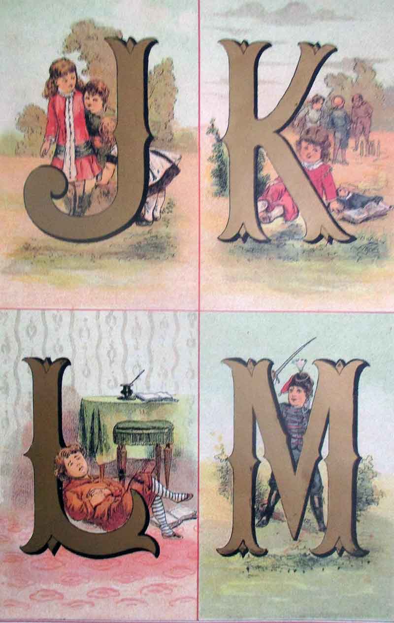N. B: Las imágenes son propiedad de Joaquín Rayego; aparecen incluidas en el "Alfabeto del Nene. Libro de Oro", Ilustrado con veintiséis láminas en cromo, y editado en 1882.