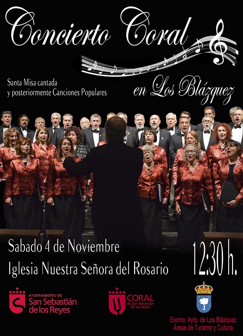 El próximo 4 de noviembre a las 12:30 h, la Iglesia de Nuestra Señora del Rosario de Los Blázquez acoge en concierto la actuación de la Coral de San Sebastián de los Reyes (Madrid). El conjunto coral formado por 45 integrantes y dirigidos por D. Fernando Terán cantará la Santa Misa e interpretarán posteriormente un repertorio del cancionero popular.
