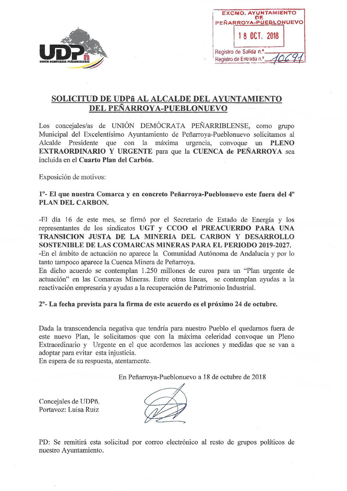 La Secretaria General de la formación, Luisa Ruiz, incidió en la gravedad de este hecho ya que van a pedir que se celebre un pleno extraordinario en el que trazar las actuaciones a realizar, entre ellas la solicitud de una reunión a la Ministra de Transición Ecológica, para abordar esta situación y que se incluya al Guadiato dentro de este plan.