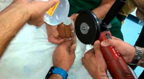 Uno de los bomberos, al percatarse del objeto, solicitó rápidamente una radial con la que, ante la mirada atónita de los presentes y el miedo del joven, consiguió hábilmente cortar el anillo y liberar el pene del joven.