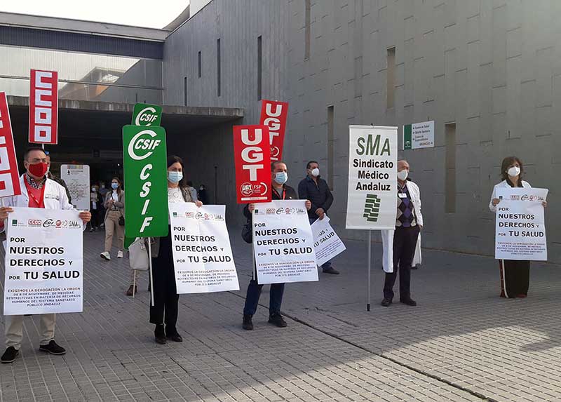 El Sindicato de Sanidad y Sectores Sociosanitarios de CCOO de Córdoba se ha concentrado junto a los sindicatos UGT, CSIF, SATSE y SMA a las puertas del CARE Carlos Cartilla del Pino para exigir a la Consejería de Salud de la Junta de Andalucía la derogación inmediata de la orden de 8 de noviembre de 2020, por la que se establecen medidas restrictivas en materia de recursos humanos y medios para la gestión de la situación de crisis sanitaria, por constituir un ataque directo a los derechos de los más de 120.000 profesionales del Sistema Sanitario Público de Andalucía (SSPA). “La medida impuesta de forma unilateral, sin previa negociación, representa el mayor ataque conocido contra los derechos laborales del personal de nuestro sistema sanitario público”, ha dicho el secretario General del mencionado sindicato, José Damas.