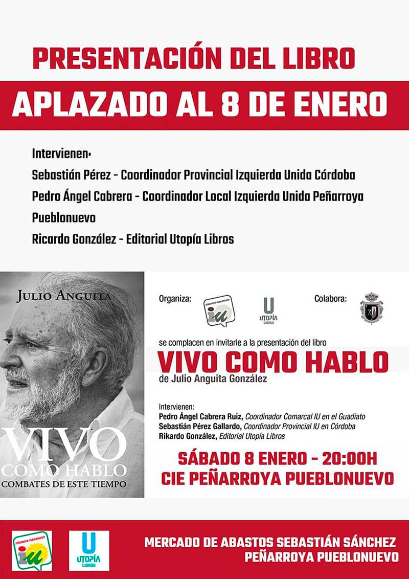 Izquierda Unida de Peñarroya-Pueblonuevo, tiene previsto presentar el libro “Vivo como hablo”, escrito por Julio Anguita González, editado por Utopía Libros.