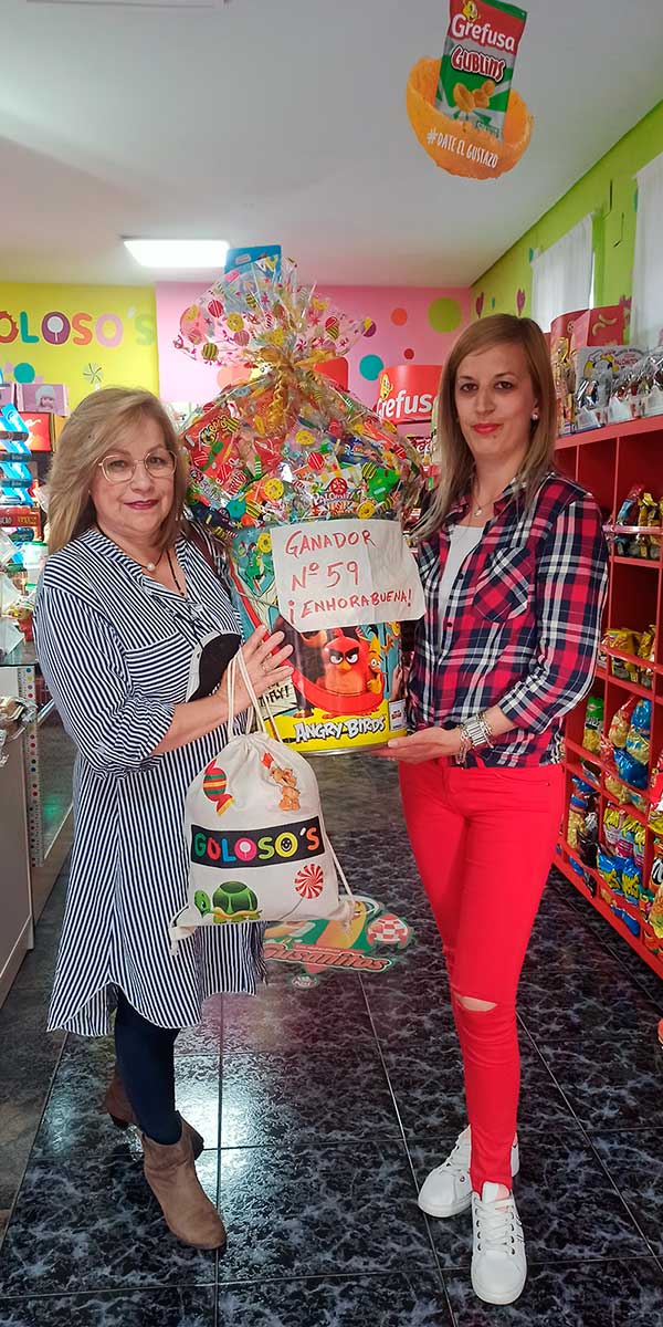 El pasado domingo 8 de mayo, Mari Carmen Calderón Jurado, recogía su cesta llena de golosinas de la mano de Almudena Machuca. La cesta fue sorteada con motivo del X Aniversario de la tienda de golosinas y aperitivos Goloso's de Peñarroya-Pueblonuevo.