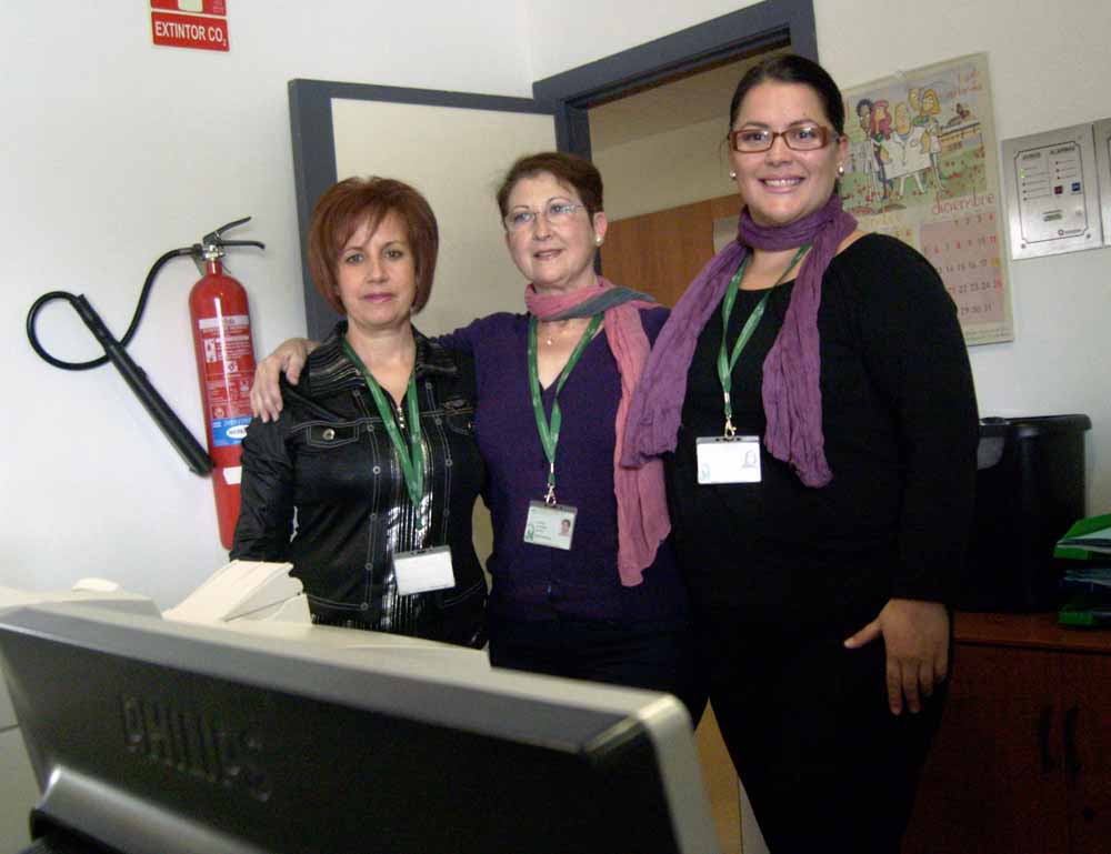 Pie de foto: Las tres administrativas del Servicio de Admisión de Urgencias de Gestoría del Usuario del centro, autoras del póster galardonado