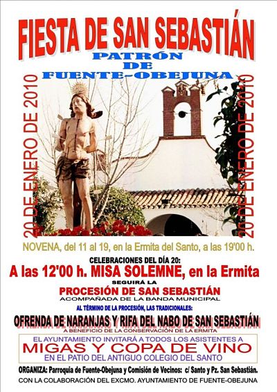 Como viene siendo tradición, el 20 de enero, se celebra en el municipio el "Día de San Sebastián", patrón de Fuente Obejuna. Tendrán lugar diferentes actos durante la celebración de la fiesta. NOVENA del 11 al 19 de enero, en la Ermita de San Sebastián a las 19'00 h. El día 20, tendrá lugar una MISA SOLEMNE en la Ermita, seguida de la procesión de San Sebastián acompañada de la Banda Municipal, al término de la procesión se concluirá con las tradicionales ofrendas de naranjas y la rifa del nabo de San Sebastián (a beneficio de la conservación de la ermita).