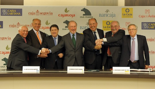 Esperanza Aguirre dice que se celebró “a punta de pistola”. De izquierda a derecha, un repaso a los méritos y salarios de estos siete novios para siete cajas que han dejado el mayor agujero financiero de la historia de España.