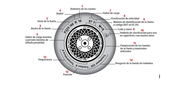 Cuando por ejemplo veamos esta serie de números y letras -185/45 R 16 81Q-, no pensemos que es un jeroglífico, con él podemos saber varios indicadores y características importantes del neumático. En primer lugar, las primeras tres cifras hacen referencia al ancho del neumático expresado en milímetros. Los dos números siguientes expresan la altura del flanco del neumático, también en milímetros, la letra R puede aparecer o no y, en el caso de aparecer querrá decir que el neumático es de tipo radial. Las siguientes dos cifras (16) es el diámetro de la llanta expresado en pulgadas, mientras que los dos últimos números y la letra que aparece a continuación (81Q) muestran los índices de carga y de velocidad que puede soportar respectivamente nuestro neumático. Así, el número 81 no quiere decir que pueda soportar una carga máxima de 81 kilogramos. ¡No!. Para ambos valores hay especificadas dos tablas en las que puede verse la correspondencia. En nuestro caso concreto, el número 81 indica un peso máximo de 462 kilos por rueda y la letra Q habla de una velocidad máxima de 160 kilómetros por hora (ver tablas).