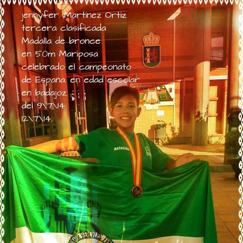 La joven villaharteña consiguió la medalla de bronce en los 50 metros mariposas. Este nuevo logro se suma al ya conseguido en el año 2013 en el Campeonato Nacional, en que ganó la medalla de plata en el mismo estilo.