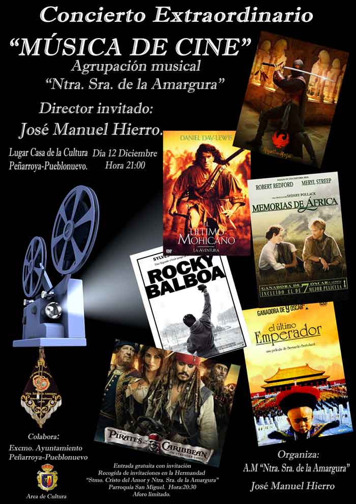En este concierto podremos escuchar a la agrupación musical interpretando bandas sonoras de películas muy conocidas como Roky, El último Mohicano… etc. Como bien es sabida por todos los lectores nuestra Agrupación está centrada en los que los cofrades llamamos, eso, música cofrade. Pero esta vez no ha podido resistirse a la idea de Don José Manuel Hierro, cuando al finalizar Semana santa nos propone esta idea tan original a modo de concierto Extraordinario. Dicho y hecho a principios del verano D. José Manuel Hierro  se pone manos a la obra realizando todos los arreglos y composiciones de todas las B.S.O necesarias para la agrupación y los componentes de la Agrupación da comienzos a los ensayos de esta nuevo estilo música, pero que como MUSICOS que son lo interpretan magníficamente, pues antes del estreno ya nos han llegado ofertas de otros lugares para su interpretación.